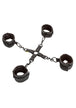 4 totally adjustable wrist and ankle cuffs. Fully adjustable with Velcro® style closures. Sturdy hog tie connector. Universal clasps and O-rings with swivel design for full dexterity. Soft and plushy interior with a vegan leather exterior. Double padded, double stitched. Functional, durable and textured design. Disassembles completely and may be used as individual wrist and ankle cuffs.