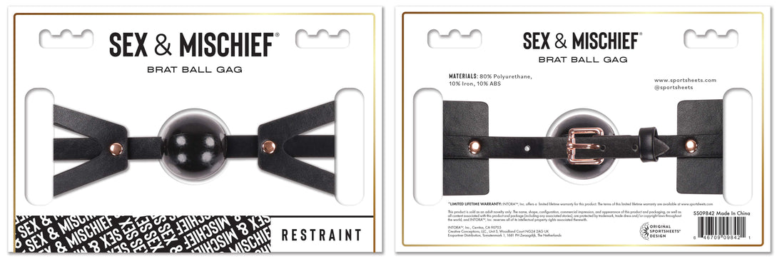 Sex and Mischief S&M Brat Ball Gag from Sportsheets. Dare them to take the words right out of your mouth with the Brat Ball Gag. Designed with an adjustable buckle and soft ball gag, you are sure to find the perfect fit for your next scene. This product pairs well with handcuffs, hog ties, and more. Product details: materials Nickel free Iron, Polyurethane PU Faux Leather, ABS Plastic. Colors: Rose Gold, Black. Categories: Bondage, Fetish, Kink, Sex Toys for Couples, Men, Women, Bondage Restraints, Gags, Muzzles. 2023.