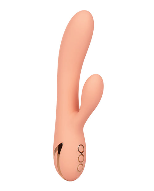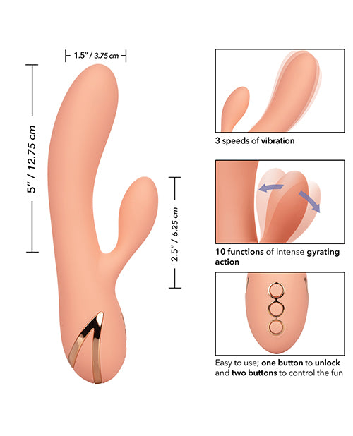 California Dreaming Monterey Magic Vibrator from California Exotic Novelties. The California Dreaming Monterey Magic has incredibly intense vibrating action in the stimulator, 10 functions of gyrating motion in the stimulator makes sure that you are never left wanting more. 3 speeds of independent shaft vibration allow you to experience the maximum in pleasure sensation with the operation of just two buttons (one controlling the stimulator, the other for the shaft). A third button controls the power, with an included three second press travel lock, preventing accidental discoveries of your favorite adult toy. A state of the art memory chip resumes on the last function used, ensuring that nothing ever gets too complicated to take away from the intense erotic power that this device delivers, running at 40 minutes on high speed or a jaw dropping 2.5 hours on lower settings. A complete charge (USB charging cord included) in just 2.5 hours ensures you are never far away from being at your best. The 5 inches shaft of the California Dreaming Monterey Magic comes with a 2.5 inches diameter making it irresistible. It is made from body-safe silicone and is waterproof for use in all types of different environments, ensuring maximum usage with minimal worries. Specifications: Color Orange. Materials Silicone, ABS Plastic with Metallic Plating. Power Source USB Rechargeable, included. Features Phthalate Free, Waterproof, Rechargeable, Vibrates. 1 year warranty. Maximum run time 150 minutes. Maximum charging time 150 minutes.