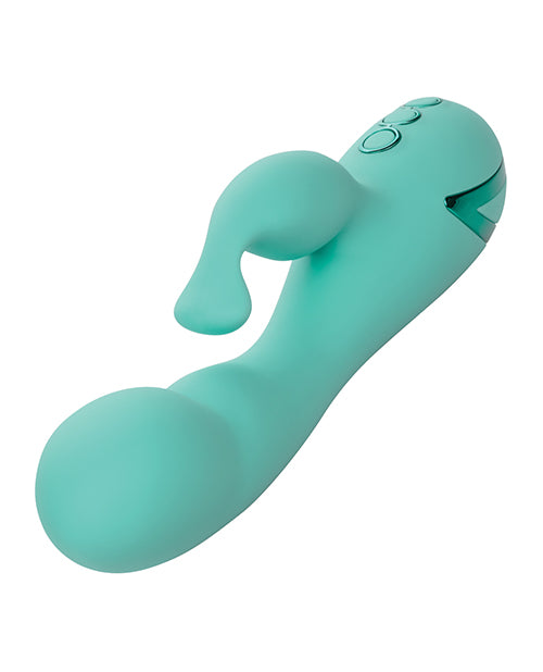California Dreaming Tahoe Temptation Vibrator from California Exotic Novelties. Take your Tahoe trip from the bedroom, with the California Dreaming Tahoe Temptation. This double vibration machine has a deep rumble in the head and shaft, and the attached external teaser is sure to deliver you to pure mountain top pleasure. The powerful rumbling massager contains a flickering pinpoint teaser designed to cover all of your most sensitive areas with the exact amount of pleasure you are looking for. With 3 speeds of deep rumbling in the sensually curving shaft of this adult toy, you can rest assure that you will not be spending your time here resting. The additional 10 functions in this vibe of independent vibration, pulsation and escalation in the stimulator will help you achieve your maximum sexual wellness. The state of the art memory chip will resume on the last function used, and the automatic travel lock will help you be sure the device is on only when you want it to be.This massager can be used solo or as a couple, and the body safe silicone will take your mind off everything else. A USB rechargeable cord is included, and will recharge the device completely in just 2.5 hours. With a run time of 40 minutes on the highest settings and 2.5 hours on low, you can always be certain that this toy is ready to keep going and going. Specifications: Color Green. Materials Silicone, ABS Plastic with Metallic Plating. Power Source USB Rechargeable, included. Features Phthalate Free, Waterproof, Rechargeable, Vibrates. Maximum run time 150 minutes. Maximum charging time 150 minutes.