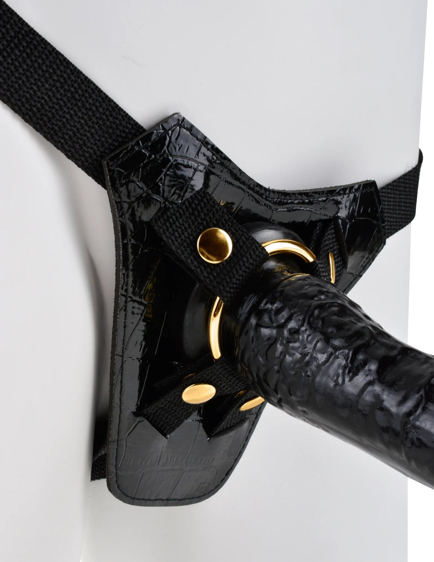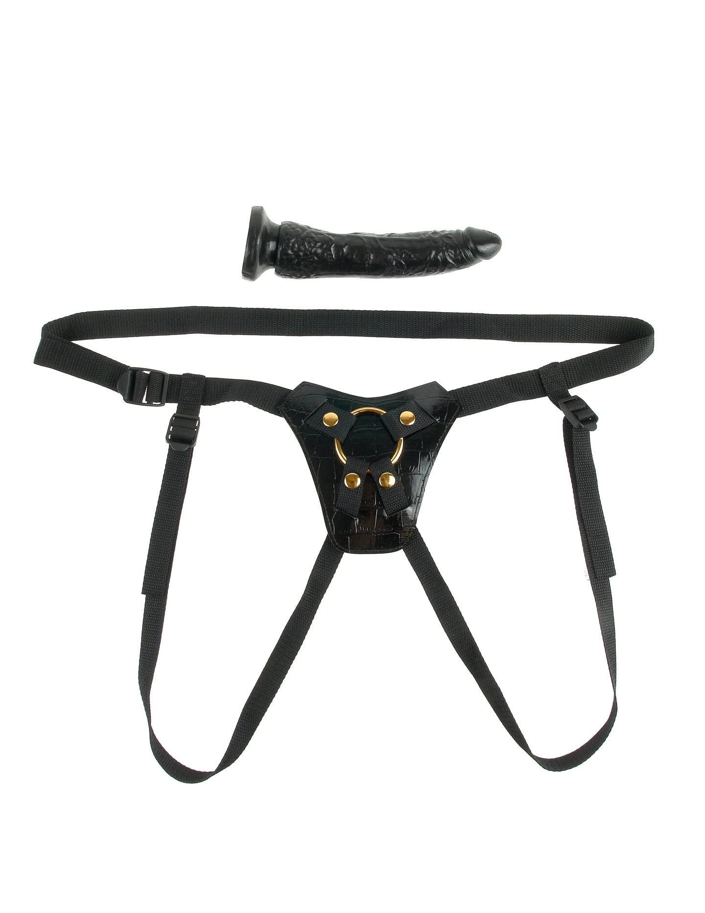 Hit the right spot every time with this elegant Strap-On. This low-rise harness features a soft plush liner that feels great against your skin, while the 4-way nylon straps are fully adjustable to fit most sizes. The metal O-ring holds everything in place when the action heats up, and can be removed to accommodate any sized O-ring.