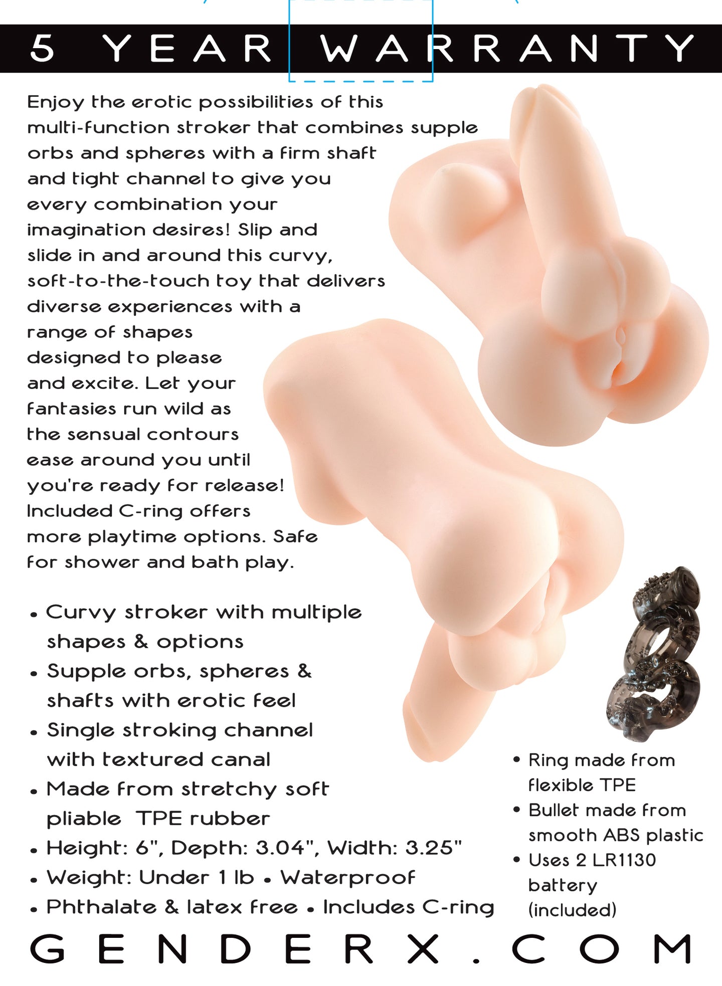Enjoy the erotic possibilities of this multi-function stroker that combines supple orbs and spheres with a firm shaft and tight channel to give you every combination your imagination desires! Slip and slide in and around this curvy, soft to the touch adult toy that delivers diverse experiences with a range of shapes designed to please and excite. Let your fantasies run wild as the sensual contours ease around you until you are ready for release! Included Cock ring offers more playtime options. Safe for shower and bath play. Specifications: curvy stroker with multiple shapes and options. Supple orbs, spheres and shafts with erotic feel. Single stroking channel with textured canal. Made from stretchy soft pliable Thermoplastic Elastomers TPE. Height 6 inches, depth 3.04 inches, width 3.25 inches.