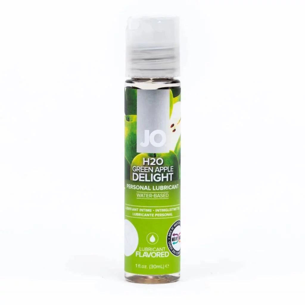 Jo H2O Water Based Flavored Lubricant 1oz - Green Apple Delight. JO H2O Green Apple Delight flavored lubricant lets you enjoy the light tartness of green apples. Featuring a water-based formula and bright and juicy green apple flavoring, its sensual, comforting glide and silky-smooth feel are perfect for any intimate moment, particularly oral play. And when you’re done, it cleans off easily and leaves your skin feeling soft and moisturized. Unisex.