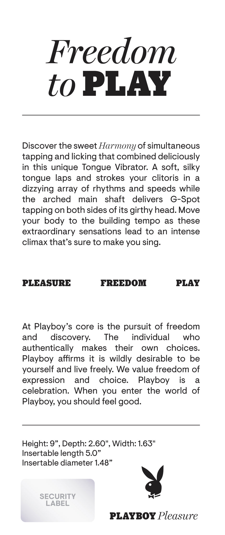 Playboy Harmony Tongue Vibrator from Evolved Novelties. Freedom to Play: Discover the sweet Harmony of simultaneous tapping and licking that combined deliciously in this unique Tongue Vibrator. A soft, silky Tongue laps and strokes your clitoris in a dizzying array of rhythms and speeds while the arched main shaft delivers G-Spot tapping on both sides of its girthy head. Move your body to the building tempo as these extraordinary sensations lead to an intense climax that is sure to make you sing. Panel details: Play with me key feature Clitoral Tongue Licking, G-Spot Double Tapping. Vibration: 10 tapping and 10 flicking speeds and rhythms, motors controlled separately. Materials: body safe Silicone, ABS Plastic. Phthalate free and Latex free. Waterproof. Warranty Five years. Rechargeable: USB magnetic cable included. Size Specifications Height 9 inches, Depth 2.60 inches, Width 1.63 inches. Insertable length 5.0 inches, Insertable diameter 1.48 inches. Categories: Vibrators, Eco-Friendly Sex Toys, Rechargeable Vibrators, Tongue Vibrators, Sex Toys for Women, G-Spot Clit Stimulators. 2024.