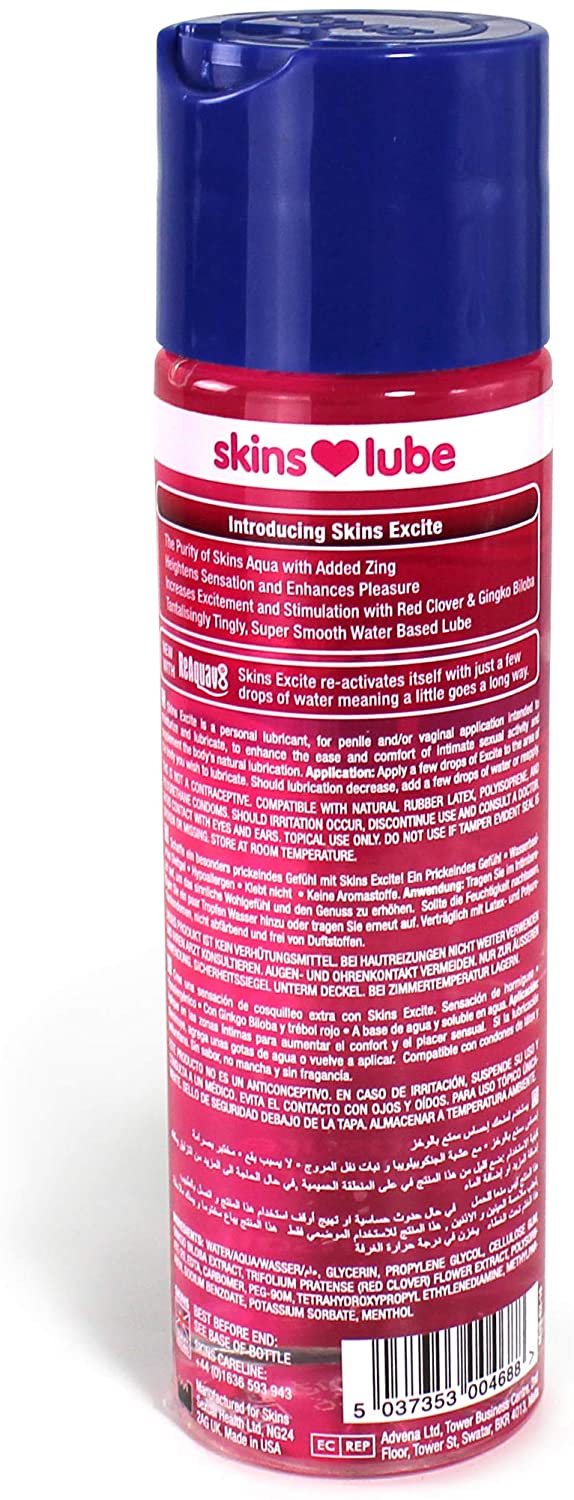 Skins Excite, has all the fun and goodness of Skins Aqua lube but with added zing. Featuring L’Arginine it increases blood flow to the area where the lube is. This heightens sensation for women and leads to a firmer feeling erection for men. Packed full of natural ingredients to make you tingle in all the right places. We took the Skins Aqua formula and added the libido-boosting properties of red clover and ginkgo biloba. The result, a tantalisingly tingling lube to stimulate arousal and take you to new heights. Passion & pleasure together!