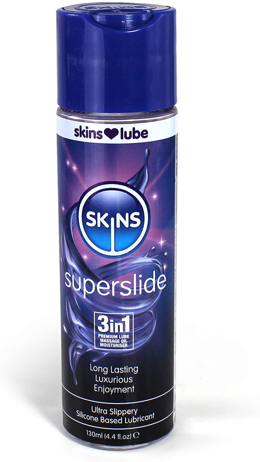 Skins Superslide contains 100% pure grade silicone lubricant making it ultra-long lasting. Silicone will not harm latex and is perfectly safe for internal use as silicone molecules are too big to enter the body through the skin or body linings. Just remember not to use silicone with silicone toys.
