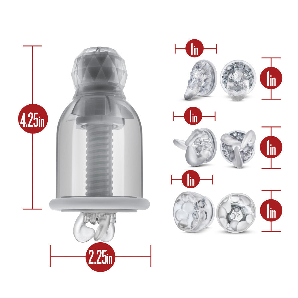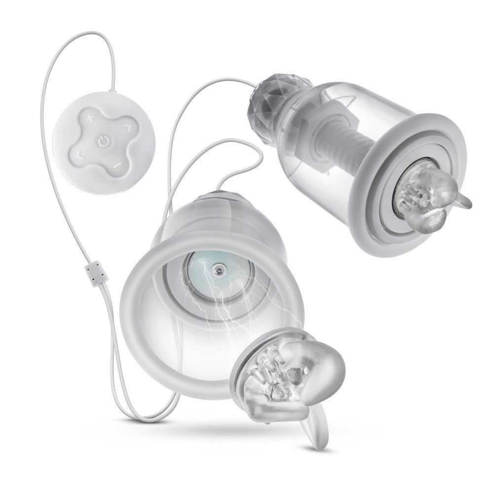 Discover a whole new world of pleasure. Blush's latest creation, Titillator is a wearable nipple stimulating device like no other. Nipple play can be enjoyed by people of all genders and sexual orientations, and can be incorporated into a variety of sexual activities. Nipple play can be a highly sensitive and pleasurable experience, as the nipples are an erogenous zone that is rich in nerve endings. For some people, nipple stimulation can even lead to orgasm. So how can the Titillator help you enjoy nipple play? The soft textured ticklers inside of the cups are positioned directly over and around your nipples. The ticklers rotate at different speeds with different patterns massaging, rubbing, tickling and caressing your nipples. Choose from 90 unique functions consisting of 9 unique patterns. Each pattern has 10 speeds to choose from. To use: twist down and place cups over your breasts. Then twist the top of the cups position the ticklers. Use the controller to control the speed and patterns of massage. 3 unique soft textured nipple stimulating attachments are included. Attachments can be conveniently attached or detached via a built in magnet. Product is rechargeable, requiring no batteries. USB charging cable is included. Each Cylinder measures 4.25"L x 2.25"W. PLEASE NOTE: To attach to breasts, twist all the way down. Attach against the skin, then twist UP to increase suction and turn on twisting nipple massagers. Not doing so will result in a lack of suction and the attachments falling off.