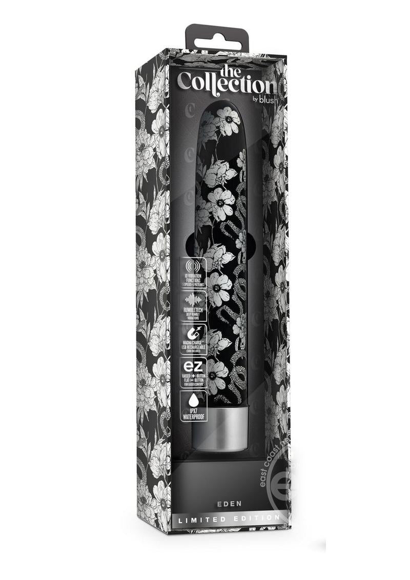 Introducing The Collection Eden, the ultimate slimline vibrator designed to elevate your pleasure. With RumbleTech technology, experience deep, rumbly vibrations and indulge in 10 vibration functions. With 5 speeds and 5 patterns to choose from, you can customize your pleasure to perfection. Eden is designed with a raised plus button for better control. Easily navigate through the various vibration functions in the dark, either on your own or with a partner. Say goodbye to batteries with Magna Charge™ USB Rechargeable technology. Take your pleasure to new depths with the IPX7 Waterproof feature of Eden. The Eden is not just a sex toy, it's an invitation to your own personal paradise. Embrace your desires and discover the Eden you've been longing for!