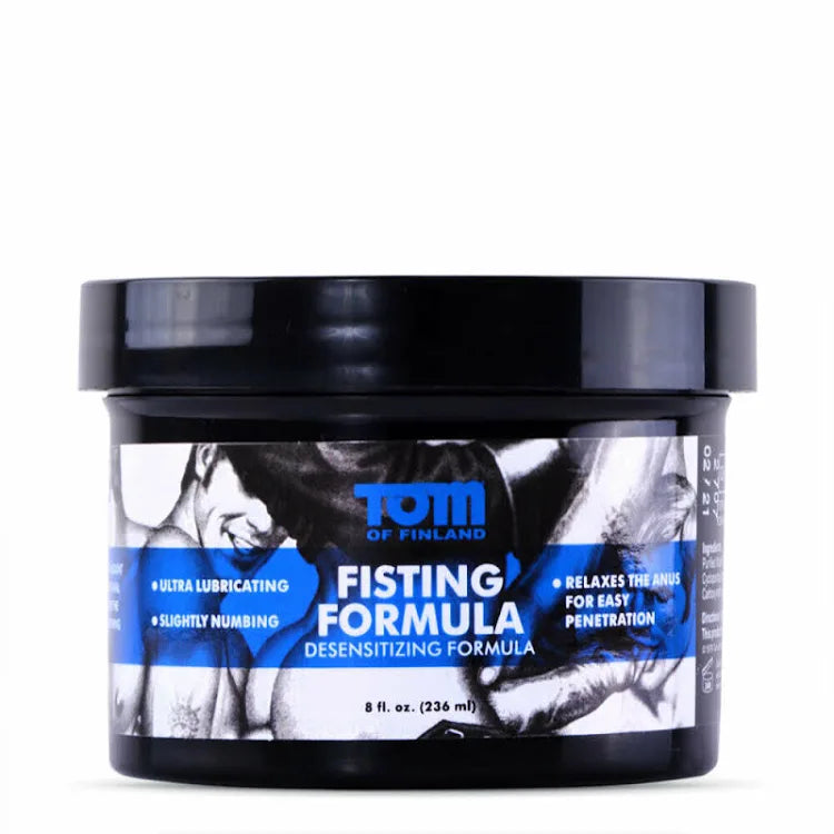 Tom of Finland Fisting Formula Desensitizing Cream with Benzocaine. Ultra lubricating. Slightly numbing. Relaxes the anus for easy penetration. This ultra lubricating, slightly numbing cream relaxes the anus and prepares you for easy penetration. Provides just the right amount of numbing to make it ideal for all types of anal stretching play. This oil-based formula provides the maximum amount of slickness, and is specifically formulated for the deepest penetration.Size 8 fluid ounces. Active ingredient: 5% Benzocaine. Color White. Note: this product is not recommended for use with latex condoms.