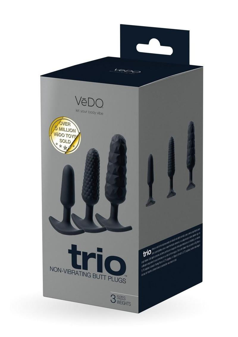 TRIO OFFERS A SET OF THREE DIFFERENTLY SIZED, WEIGHTED, AND TEXTURED NON-VIVRATING BUTT PLUGS THAT WILL BRING PLEASURE TO BEGINNERS, SEASONED VETERANS, OR ANYONE WANTING TO EXPLORE A BIT OF BACKDOOR PLAY. EACH PLUG IS PERFECTLY SHAPED WITH A TAPERED TIP FOR EASY INSERTION AND A LONG NECK TO ENSURE IT STAYS SECURELY IN PLACE. WHETHER YOU'RE INCLINED TO TRY THE BIG BOSS AT 5.75 INCHES, THE HEAVILY WEIGHTED ROARING RUMP AT 4.75 INCHES, OR SLIPPERY SMOOTH AT 3.75 INCHES, YOU'R
