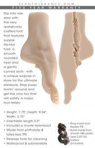 Slip into size sexy with this very realistically crafted foot that features supple life like toes, a smooth rounded heel and a gently curved arch with a unique surprise in store for the ultimate pleasure.