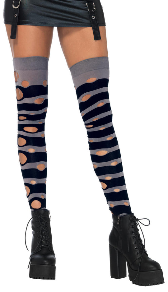 Leg Avenue Distressed Opaque Striped Thigh High - Black/Grey - O/S