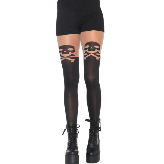 Leg Avenue Spandex Skull and Crossbone Pantyhose with Sheer Thigh Accent - Black - O/S