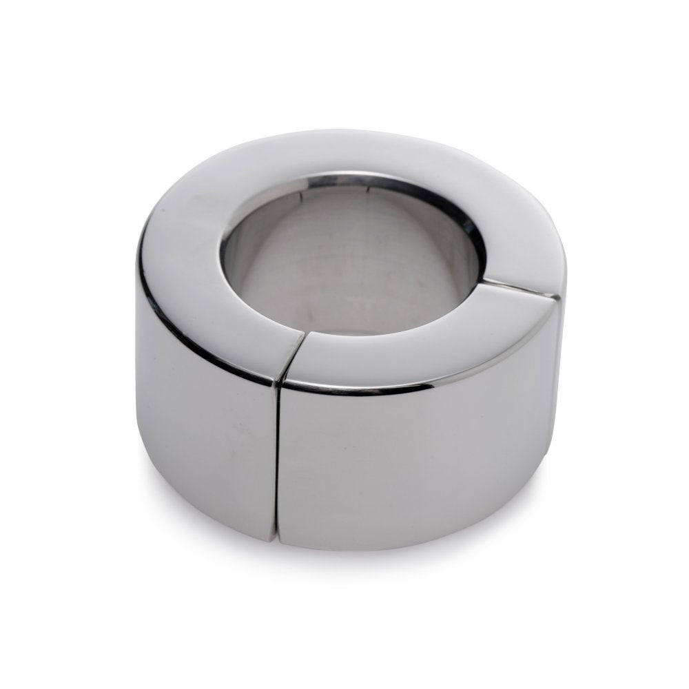 Whether you enjoy the weight and pull of a heavy ball stretcher during masturbation, or you are tormenting your sub with some CBT action, this heavy magnetic device is a unique and innovative new way to play! Pull the scrotum down away from the body and through the opening in the hefty stainless steel ring. Make sure all skin is against the back of the stretcher before replacing the magnetic closure. The stainless steel will clink loudly together, leaving the balls trapped in the heavy instrument. When you let go, it will yank down, pulling on the scrotum for an incredible sensation.