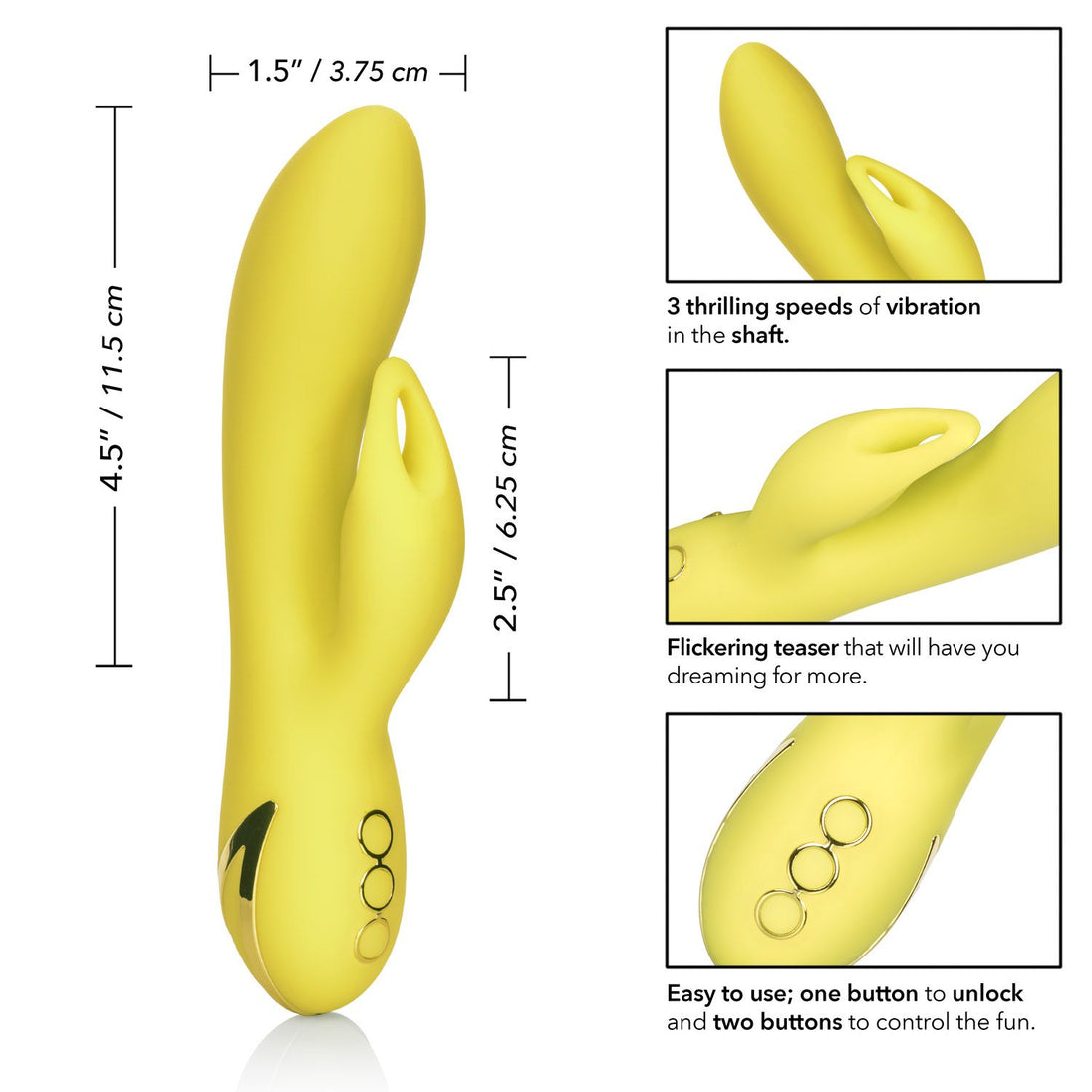 California Dreaming Venice Vixen Yellow Rabbit Style Vibrator. Dive deep into a sea of pleasure and sun kissed fantasies with the naughty California Dreaming Venice Vixen. The luxurious massager has 10 intense vibration functions, 3 independent shaft vibrations and a unique teaser with a sensual clitoral encaser for one of a kind pleasure experience. The seamless silicone body and flickering teaser put out knee shaking stimulation in and out of the water. Whether you are looking to turn up the heat with a lover or just enjoy some sensual solo time, this ravishing rabbit is ready. While contoured clitoral encaser moves with your body, the 3 independent shaft vibrations deliver intense internal stimulation. Control and customize your pleasure play with the independently controlled shaft and teaser vibration massager functions. Recharge the vibrating massager in 2.5 hours with the provided USB charging cable to enjoy 45 minutes of high speed stimulation or 2.5 hours of low speed vibrations. Enjoy frustration free control with the easy touch 3 button control pad and security lock feature for travel ready teasing. The virtually seamless body and self sealing charging port allow you to get this versatile waterproof vibrating massager for a dip. The hypoallergenic premium silicone is body safe, unscented and phthalate free to keep you most sensitive spots, happy and healthy. Color Yellow. Materials Silicone, ABS plastic with Metallic Plating. Power source USB Rechargeable, included. Features Phthalate Free, Waterproof, Rechargeable, Vibrates. 1 year warranty. Maximum run time 150 minutes. Maximum charging time 150 minutes.