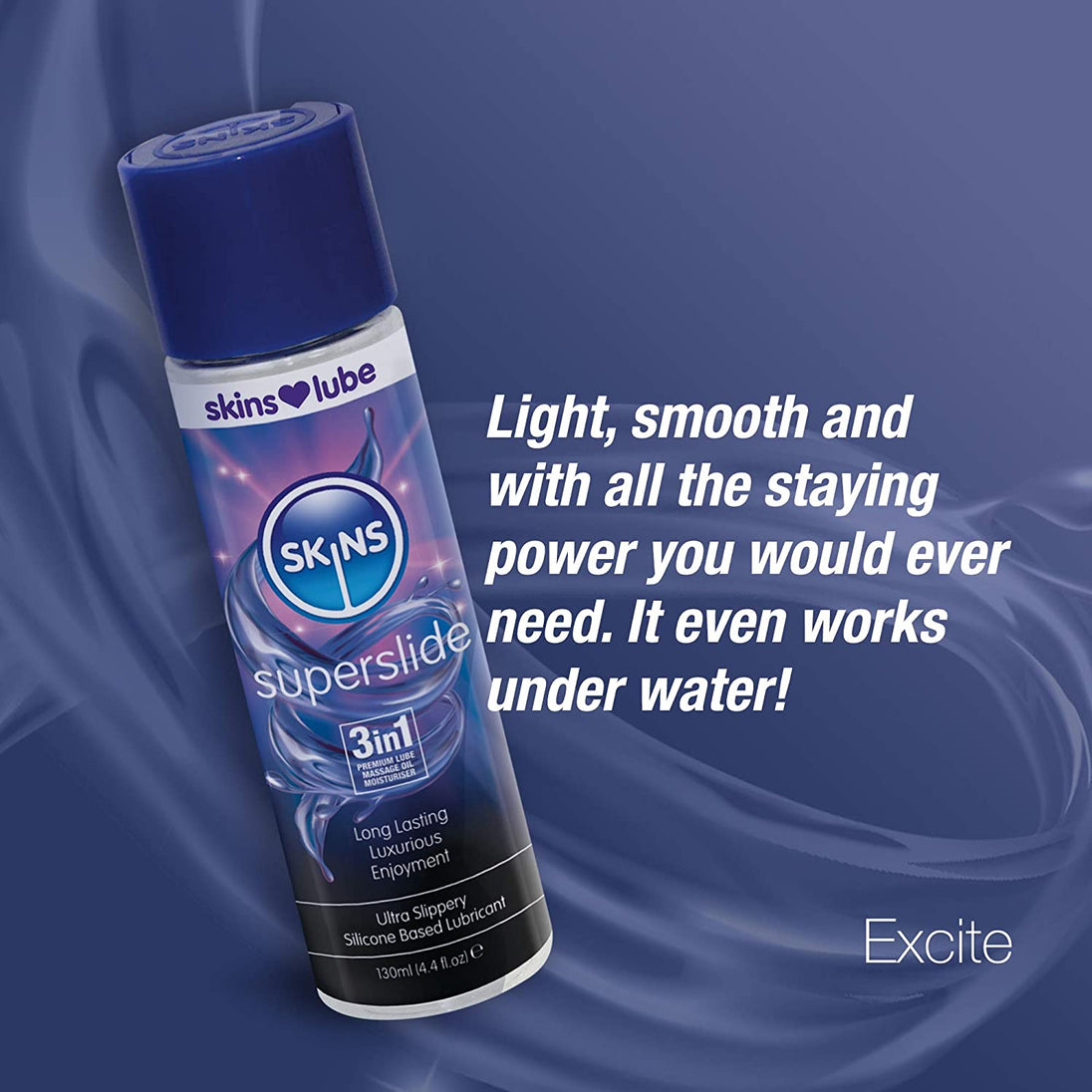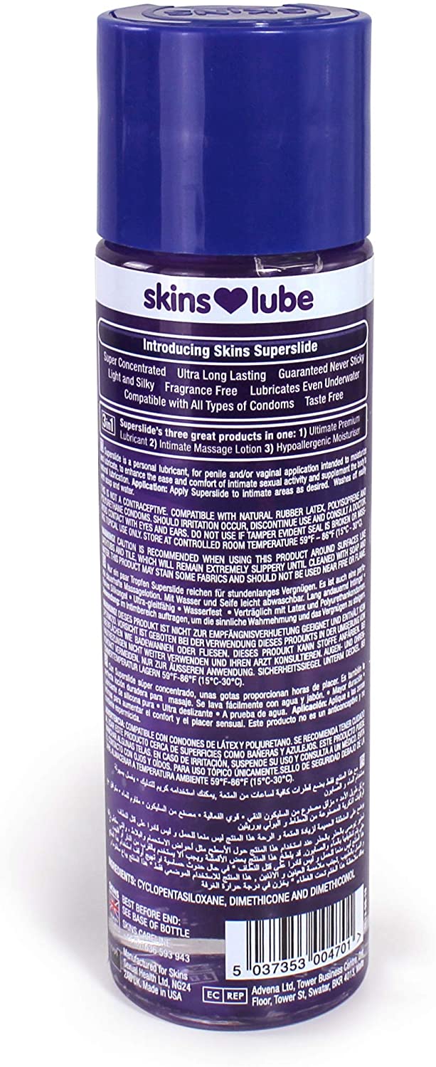 Skins Superslide contains 100% pure grade silicone lubricant making it ultra-long lasting. Silicone will not harm latex and is perfectly safe for internal use as silicone molecules are too big to enter the body through the skin or body linings. Just remember not to use silicone with silicone toys.