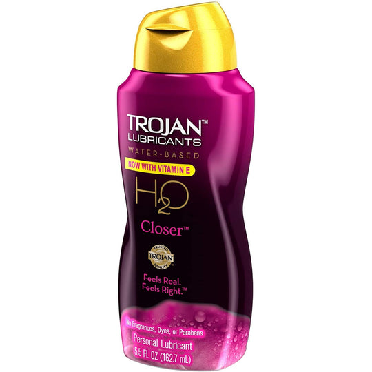Trojan H2O Closer Lubricant 5.5 ounces. Feels real, feels right.Hyaluronic Moisturizers hold 1000 times their weight in moisture for advanced lubrication. Works effectively and then seamlessly vanishes after use. Latex condom compatible. Sex toy friendly.Regular price $21.99 -