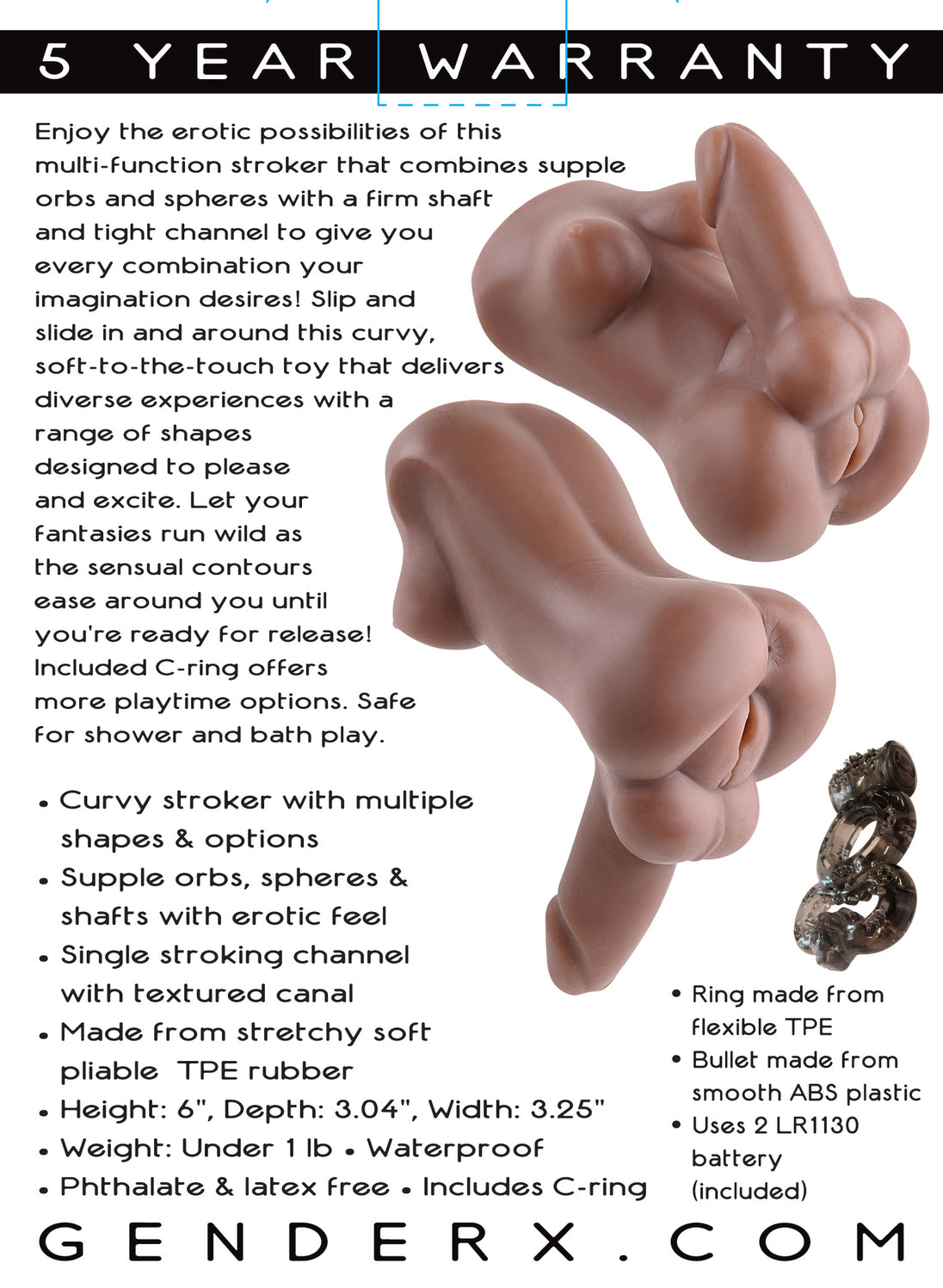 Enjoy the erotic possibilities of this multi-function stroker that combines supple orbs and spheres with a firm shaft and tight channel to give you every combination your imagination desires! Slip and slide in and around this curvy, soft to the touch adult toy that delivers diverse experiences with a range of shapes designed to please and excite. Let your fantasies run wild as the sensual contours ease around you until you are ready for release! Included Cock ring offers more playtime options. Safe for shower and bath play. Specifications: curvy stroker with multiple shapes and options. Supple orbs, spheres and shafts with erotic feel. Single stroking channel with textured canal. Made from stretchy soft pliable Thermoplastic Elastomers TPE. Height 6 inches, depth 3.04 inches, width 3.25 inches.