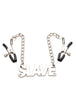 Make sure everyone knows their place when they wear these nipple clamps. The large, bold font spells out SLAVE and with a tug against the clamps you can put them in their place if they forget! The nickel free metal is perfect for sensitive skin and the shining metal looks great as a kinky accessory!
