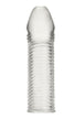 Treat your partner to enhanced pleasure with the 6.5" Wavy Ribbed Penis Extension that delivers mind-blowing stimulation with its rigidly textured surface. Made from durable, body-safe material, the extension clings onto the wearer easily and securely. Its all-over ribbed design rubs and massages thoroughly for orgasmic sensation. Easy to clean, this sex accessory offers easy maintenance, allowing you to focus on enjoying your experience. Perfect for adding extra length and girth along with intense textured contact, this penis extension enhances the wearer's experience as well by improving performance and boosting your confidence. This discreet item is also easy to store.
