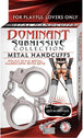 For playful lovers only. Dominant Submissive Collection Metal Handcuffs. Police style metal hand cuffs. Free blindfold included. Handcuffs complete with 2 release keys and safety release. Material: Metal. Length 10.625 inches, Width 3.125 inches. Dominant Metal Handcuffs from Nasstoys of New York.