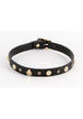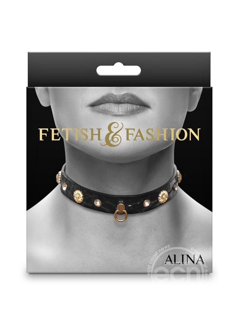 Fetish & Fashion’s Alina Collar is perfect for a submissive lover. Designed for neck sizes from 11.5 to 17.5 inches and garnished with crystal gems and golden sun charms, Alina features an adjustable buckle closure and O-ring for a tether or leash. Crafted from man-made materials (PU) and nickel-free hardware. Leash sold separately.