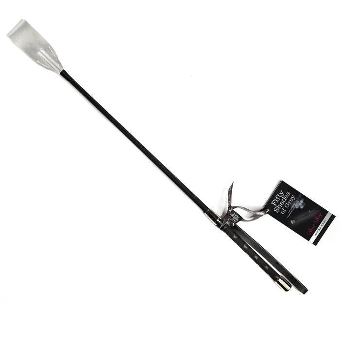 Fifty Shades of Grey Official Pleasure Collection Sweet Sting Riding Crop from Lovehoney the sexual happiness people. Enliven your bedroom bondage play with sensual strokes and punishing spanks from this slender riding crop whip. Acting as an extension to a twitching palm, the graceful length controls a thick leather tip to whip your body into full arousal. Tracing the silver tip across your skin awakens your pleasure zones, leaving them feeling sensitized and exposed in readiness of your lover's whims. Intermittent hits leave sharp, warming stings resonating through your flesh, which slowly subside under the caress of soothing strokes to leave you tingling with desire. Offering a balance between pleasure and pain, this horse whip can be used to precisely stimulate and indulge the most sensitive areas of your body, invoking lust-filled sensations that consume you. During play, feel your senses heighten, enhancing the pleasure you experience from every touch in exchange for a few lingering seconds of pain. Erotic sensation is further expedited when combined with a blindfold, a spanker and a soft feather tickler. With hold your lover's right to sight and prepare them for play by tracing soft feathers across the skin, then slowly build sensation with the paddle before delivering licks from the riding crop. The deeper sensation of this flexible whip in contrast to softer play brings your bedroom bondage fantasy to an orgasmic crescendo. Crafted to the highest standards to ensure comfort, effectiveness and durability, Sweet Sting boasts leather detail to the wrist strap and tip, a braided stem and a soft rubber handle. Riding Crop measures 24 inches in length. Categories: Bondage, Fetish, Kink, Sex Toys for Couples, Whips, Paddles and Ticklers.