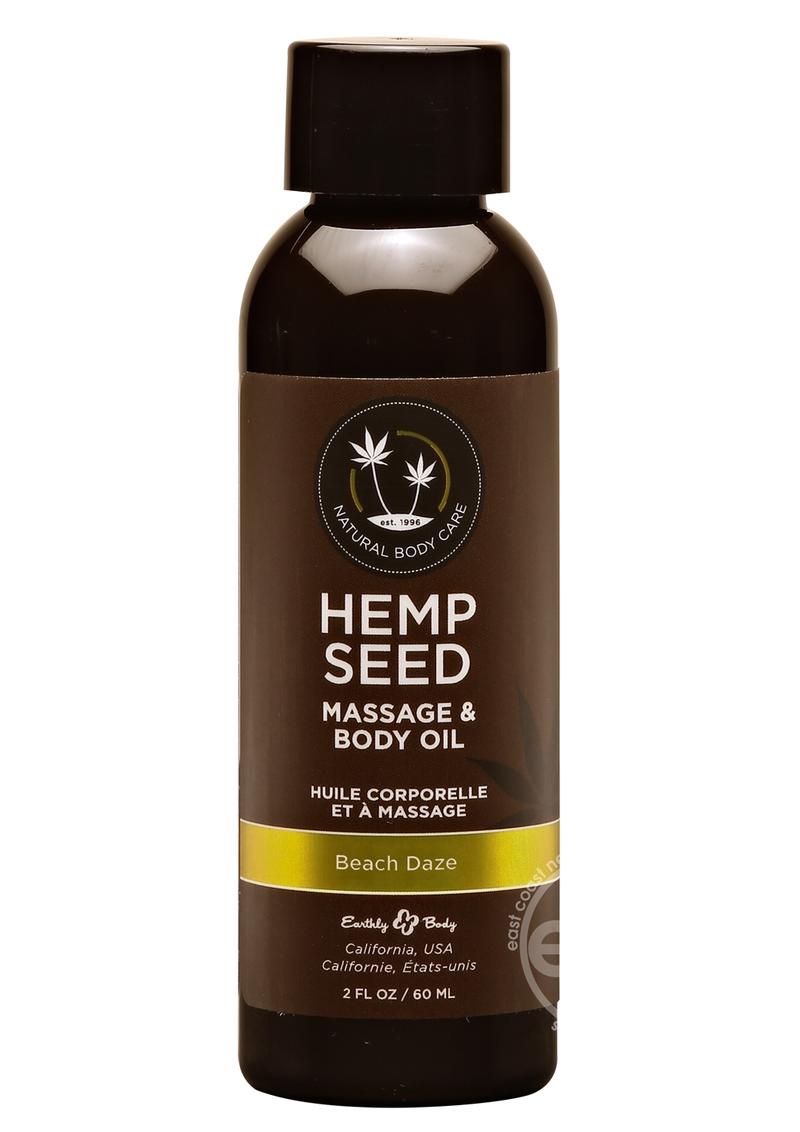 Hemp Seed Massage Oil Beach Daze 2 fluid ounces from Earthly Body. Our Hemp Seed Massage Oil Beach Daze Scent is a 100% natural blend of Hemp oil for massage and other essential oils including Hemp, Almond, Grape Seed, Apricot and Vitamin E and provides a slick, professional glide. Better yet, this nutrient rich formula absorbs into the skin for deep conditioning and moisturizing without a greasy residue. Whether you choose unscented or one of our exotic fragrances, you will not need or want to wash it off. Being made from natural oils, makes this perfect for even the most sensitive skin. For those skin types that are particularly picky with fragrances, our Massage Oil also comes in an Unscented version to ensure there is something for everyone. Do not settle for a boring, bland massage oil when you can indulge with our Hemp Seed Massage Oil. It is specially crafted with the finest of natural ingredients and comes in a variety of scents that suit any mood. As part of our commitment to the planet, Hemp Seed Massage Oil Beach Daze Scent is 100% vegan, cruelty free, and made in a solar powered facility in California. The benefits of Hemp Seed Oil Massage: a result of cold pressing hemp seeds, Hemp Seed Oil, or often referred to as hemp oil, boasts several benefits when applied to skin, including excellent ability to moisturize and soothe. Additionally, hemp oil has anti-aging properties and is said to help reduce fine lines and wrinkles. Key benefits: provides superior slip without leaving a greasy residue. Softens skin and promotes strength with nourishing vitamins. Soothes irritated and sensitive skin. Helps skin regain elasticity and suppleness. You may not be able to make it out to the beach, so we’re bringing the beach to you with our Beach Daze, all in our new Beach Daze scent, a tropical scent infused with notes of Coconut, Pineapple, and Jasmine that will take you right to a Hawaiian escape. Ingredients: Prunus Amygdalus Dulcis Oil, Prunus Armenica Kernel Oil, Vitis Vinifera Seed Oil, Cannabis Sativa Seed Oil, Persea Gratissima Oil, Sesamum Indicum Seed Oil, Parfum, Tocopherol, Rosmarinus Officinalis Leaf Oil. Made in the USA. Categories: Erotic Body Lotions, Health and Beauty Aids, Massage Lotions, Creams, Oils. Restricted, Amazon Restricted. 2023.