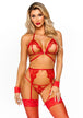 Leg Avenue Eyelash Lace Cage Strap Open Cup Bra with Heart Ring Accent, Garter Belt, G-String Panty and Wrist Cuffs (4 pieces) - OS - Red