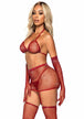5 PC Rhinestone fishnet garter skirt set with bikini top, g-string, gloves, and matching stockings.