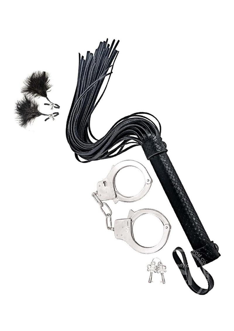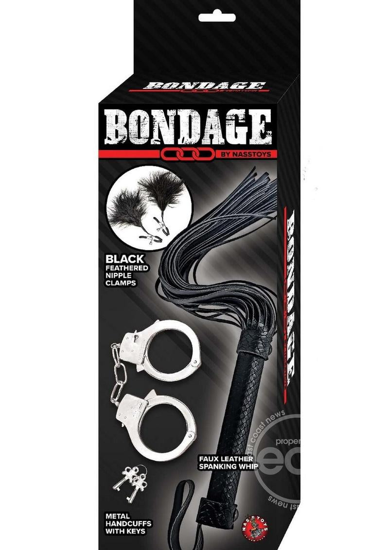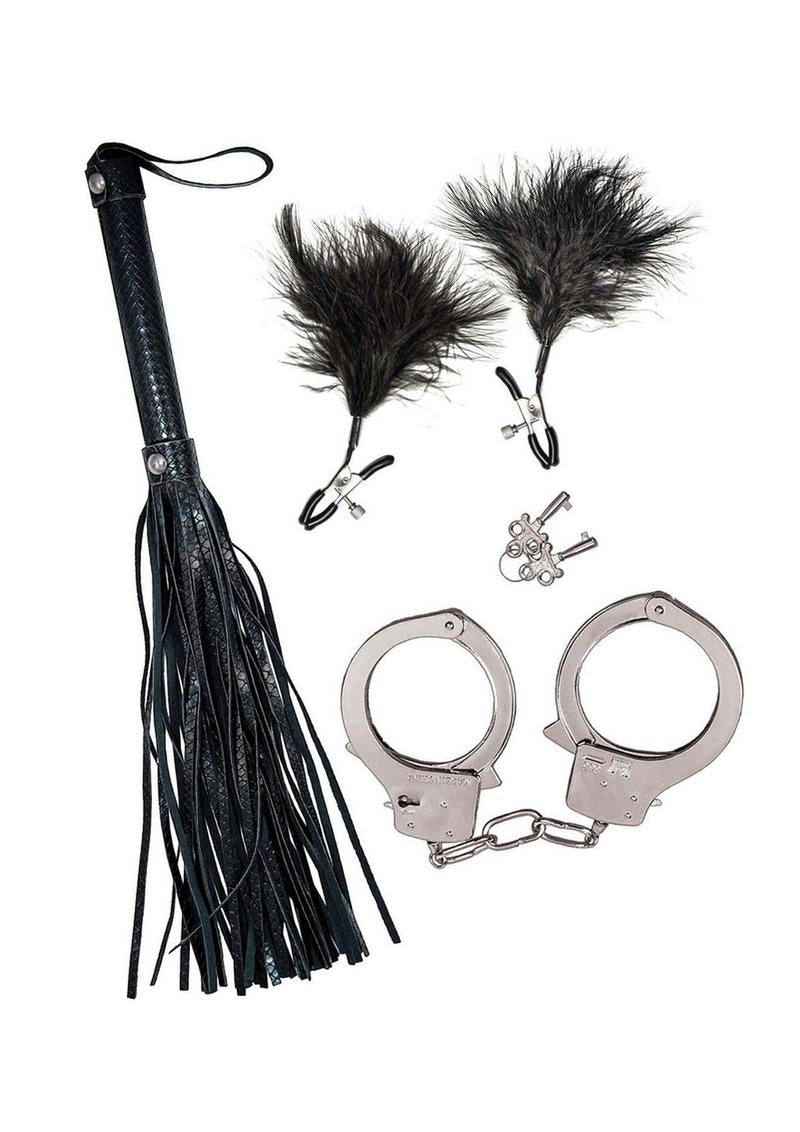 Introducing the Nasstoys Bondage Kit—the perfect blend of playful exploration and thrilling sensations, designed especially for beginners. Unleash your desires and dive into the world of bondage with confidence, courtesy of this thoughtfully curated kit. Whether you're a newcomer to the world of bondage or a seasoned explorer, the Nasstoys Bondage Kit is an excellent choice for those seeking a gentle introduction. Discover the excitement of restraint and sensory play with this carefully crafted set. Experience the thrill of being bound with the included quick-release metal handcuffs. These cuffs provide a secure yet easily removable restraint, ensuring safety and comfort throughout your playtime. Elevate your sensory experience with tantalizing nipple clamps adorned with soft red feathers. Perfect for adding an extra layer of sensation, these clamps allow you to explore the delightful balance between pleasure and a gentle, teasing touch. Unleash your inner desires with the faux leather flogger, designed to deliver a satisfying combination of pleasure and playfulness. The gentle swish of the flogger against the skin adds an exciting element to your intimate moments. The Nasstoys Bondage Kit is compact and discreet, making it an ideal companion for travel or spontaneous adventures. Bring a touch of excitement to any setting with this easily storable and transportable set.