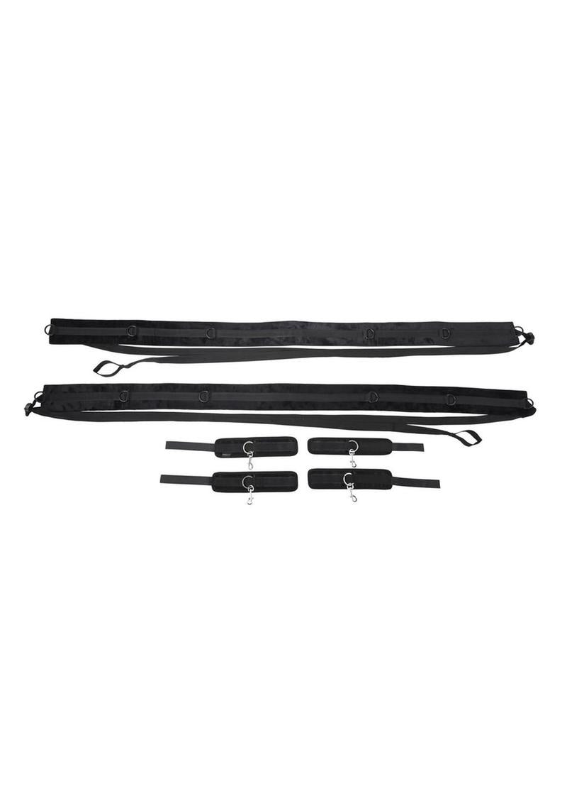 Surrender your body to entrancing restraints anywhere, anytime you want with the ultra-portable and adaptable No Matter Where Restraint System! Give your partner total control as you position yourself spread and restrained against the bed, or take your play to new heights by adjusting the straps to fit snugly against the door for standing bondage and tantalizing teasing. The possibilities are endless with the nearly 10’ of adjustable straps to tether your partner to anything you can imagine for the most erotic predicaments. Four included cuffs will keep them right where you want them in any position you like with the 6 D Ring connectors per strap stretched across 5’ of padded webbing.