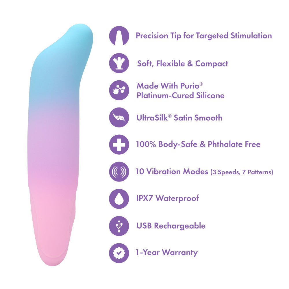 Surrender to gentle yet powerful waves of pleasure with Dolphin Kisses, a petite powerhouse that turns every touch into sensual indulgence. Designed for playful pleasure, this adorable, pocket-sized vibrator reveals 10 deep yet quiet vibration modes, with a precision tip for targeted sensations, guiding you to moments of pure bliss. Whether it’s slow, seductive foreplay, pinpoint clitoral stimulation, or sensual nipple pleasure, Dolphin Kisses delivers focused vibrations exactly where you crave them most. Explore a range of sensations, from gentle pulses to deep, resonant thrills, to discover your ultimate pleasure points. Crafted from Blush’s Purio® platinum-cured liquid silicone, the vibrator’s lusciously soft and bendable design ensures sweet and customizable pleasure. Its IPX7 waterproof rating ensures adventurous play, and USB charging adds convenience. Feel the playful caress of Dolphin Kisses and let every touch carry you away on a 'sea of intimate sensation'.