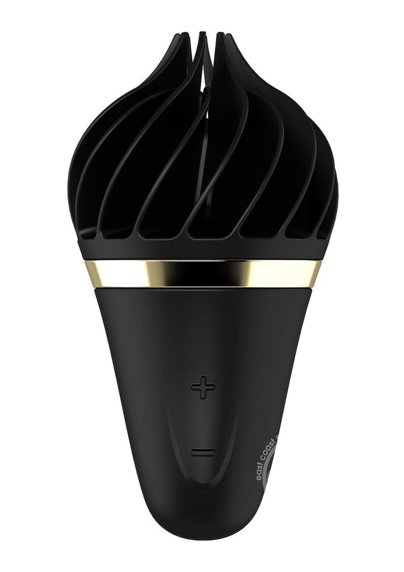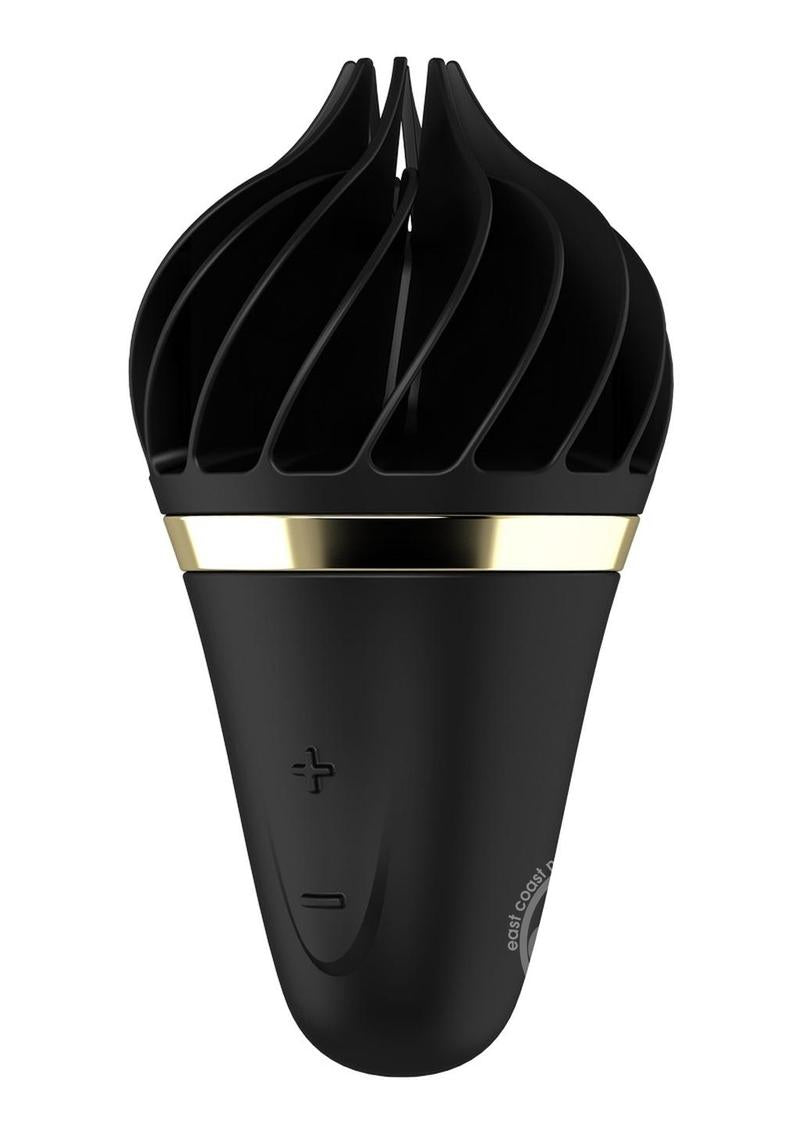 The rounded tip of this steamy waffle is made of delicate, tapered lamellae in sinful black which eagerly surround your clitoris and transport you straight to climax with their tickling rotation. The practical handle sits perfectly in your hand. The 10 varied settings include 4 rotation rhythms and 3 rotation speeds on both the left and right-hand side. The settings can be easily adjusted as required by pressing the +/- buttons.
