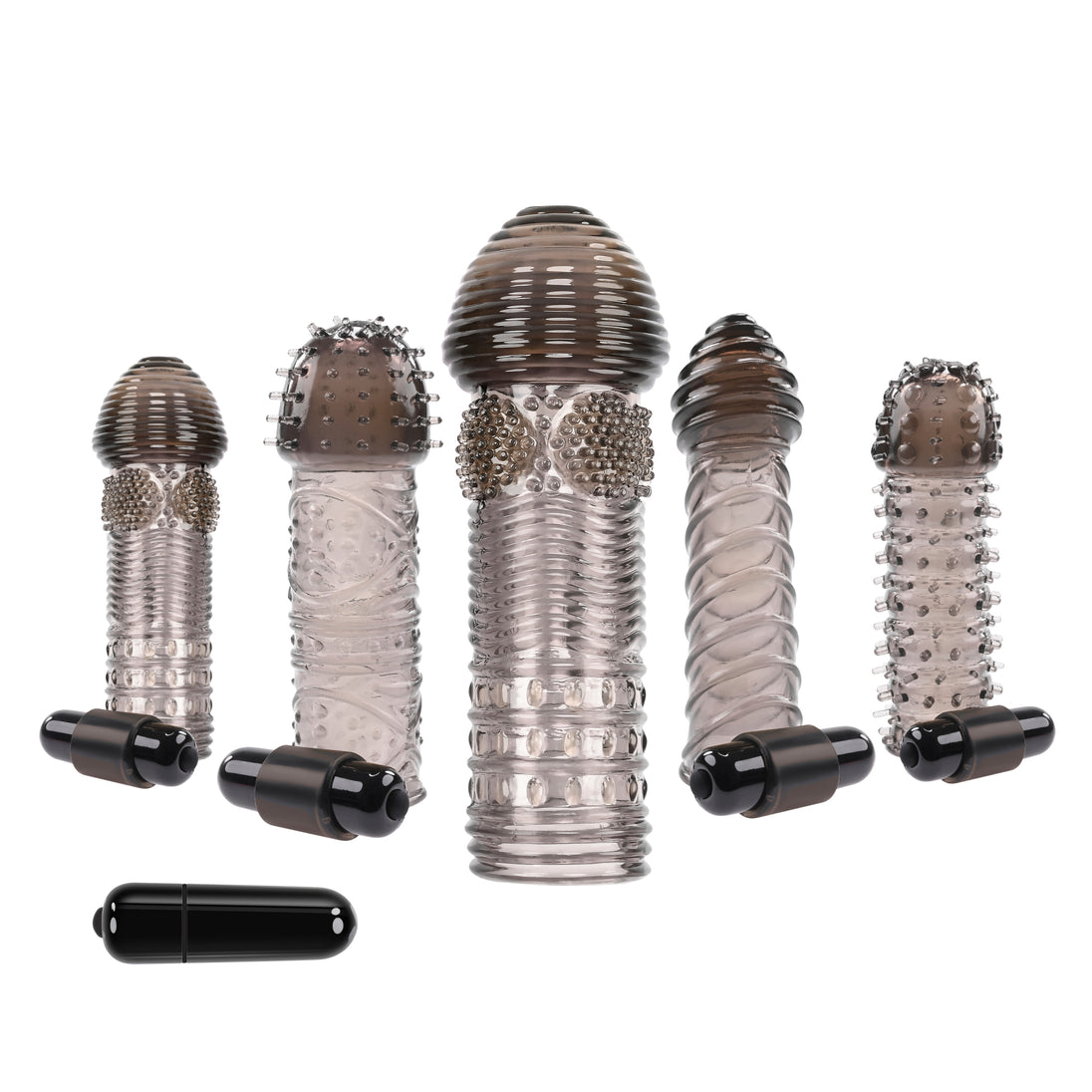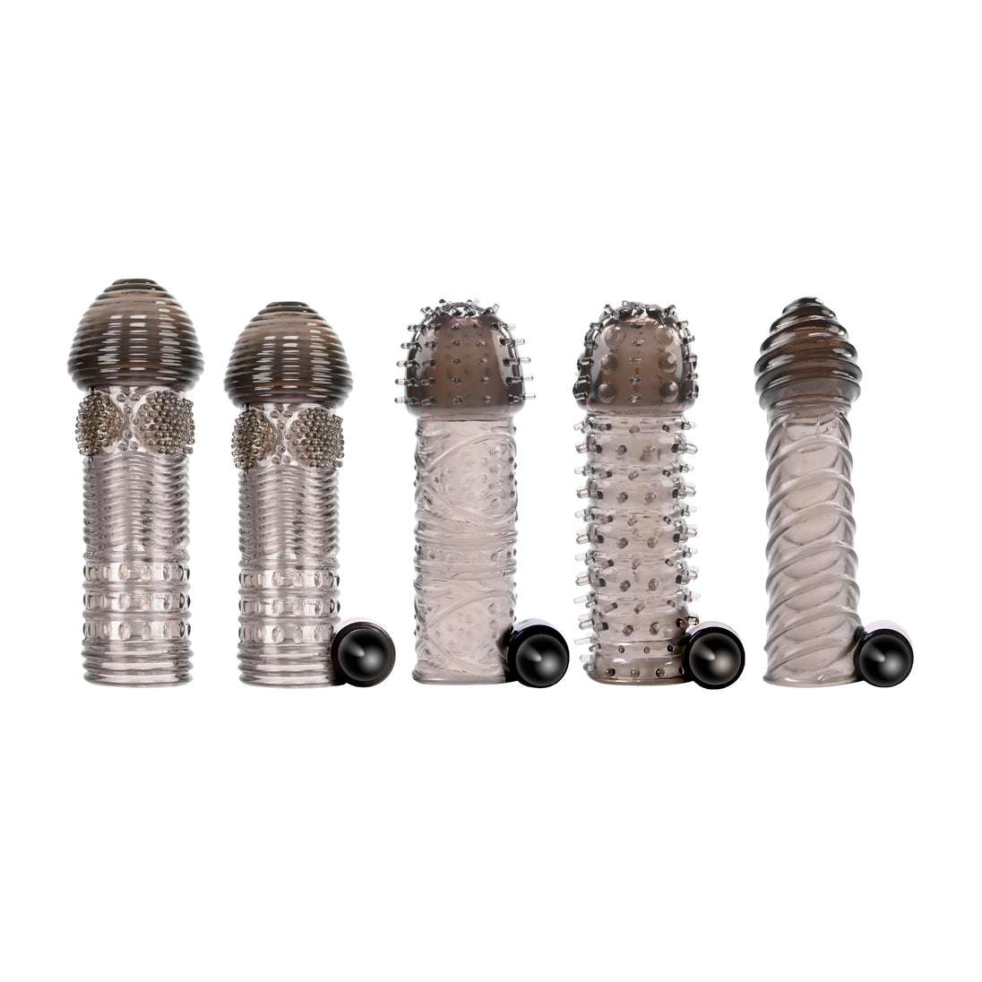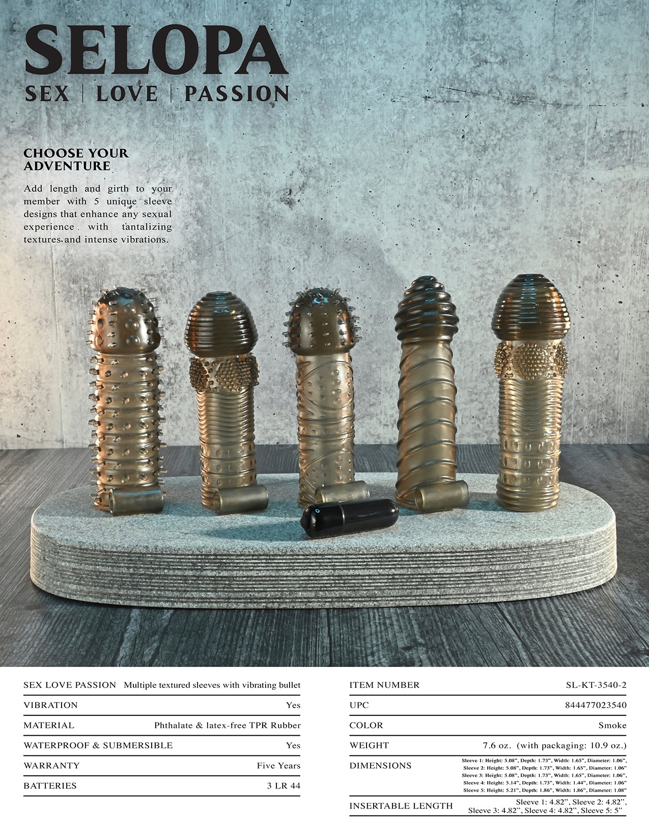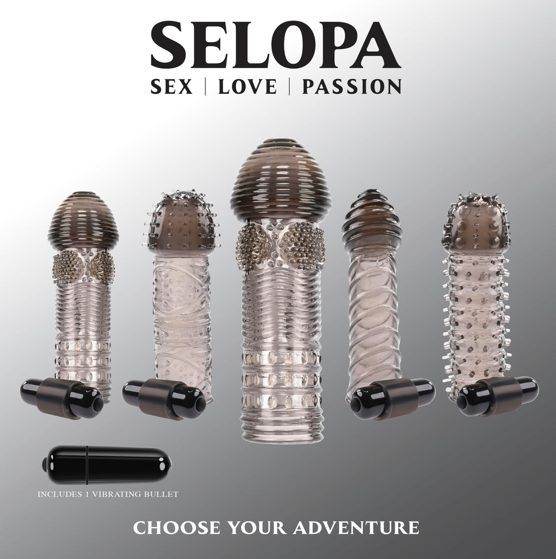 Selopa Choose Your Adventure 5 penis extensions with a vibrating bullet. Each penis sleeve is made using body safe materials phthalate free and latex free Thermoplastic Rubber TPR and the bullet vibrator is made from ABS Plastic. Add length and girth with 5 unique sleeve designs that enhance any sexual experience with tantalizing textures and intense vibrations. Features: sleeves are 5 inches in length. Made from TPR, ABS Plastic. 4 smoke colored sleeves with bullet vibrator hosters at the base of the sleeve. Waterproof. 1 clear sleeve without holster. 1 vibrating bullet with batteries included. Love, sex, passion. Categories: Bullets, Eggs, Sex Toys for Couples, Men, Women, Penis Extensions, Vibrator Sleeves, Vibrating Bullets, Eggs, Male Extensions. 2023.