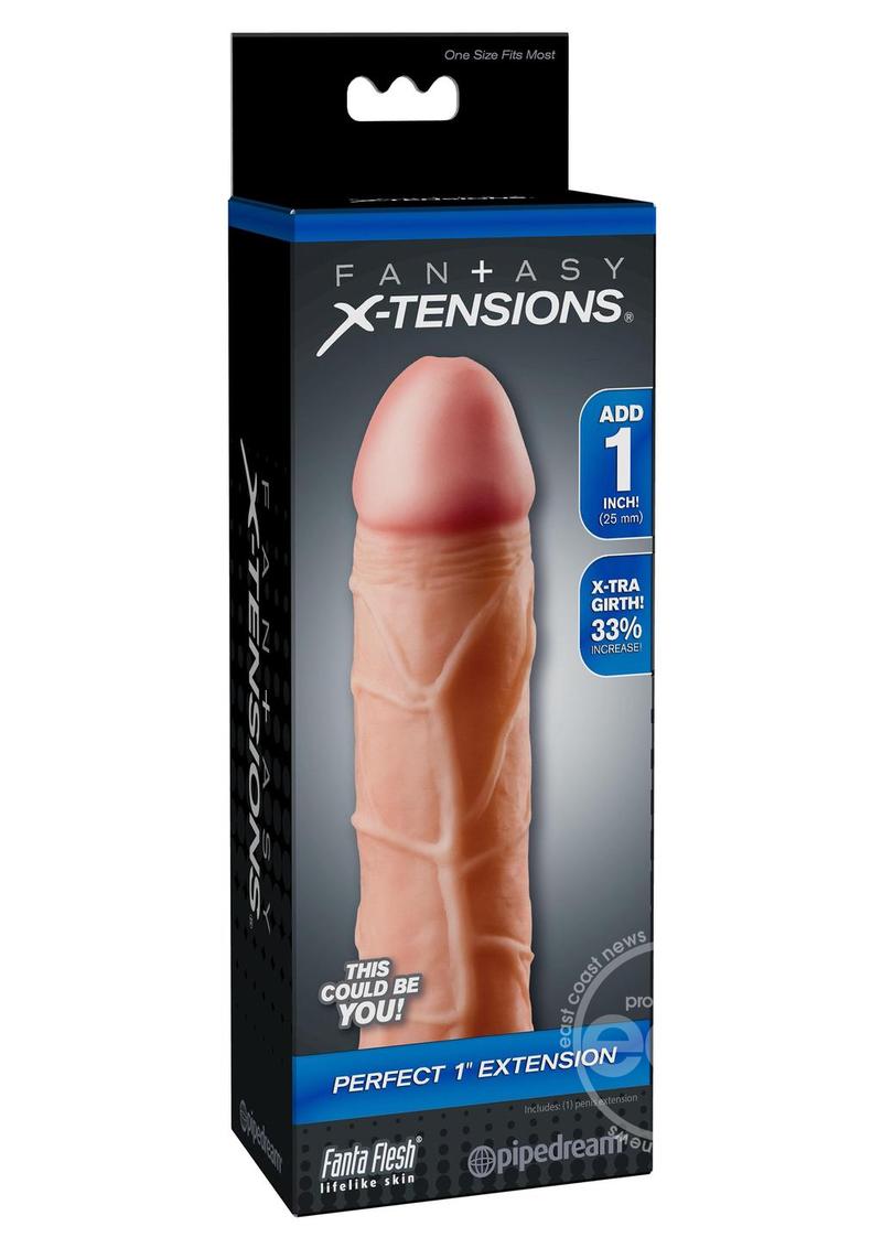 The Perfect 1" Extension is a customizable extension that can be easily trimmed at the base for a perfect fit. It's super-stretchy to accommodate most sizes and snug enough to help you last longer. Your partner will enjoy deeper penetration with the 1" extension at the tip, while the ultra-lifelike shaft makes you 33% thicker to offer a fuller feeling and exceptional climax. The super-soft Fanta Flesh material feels like a second skin" only better!