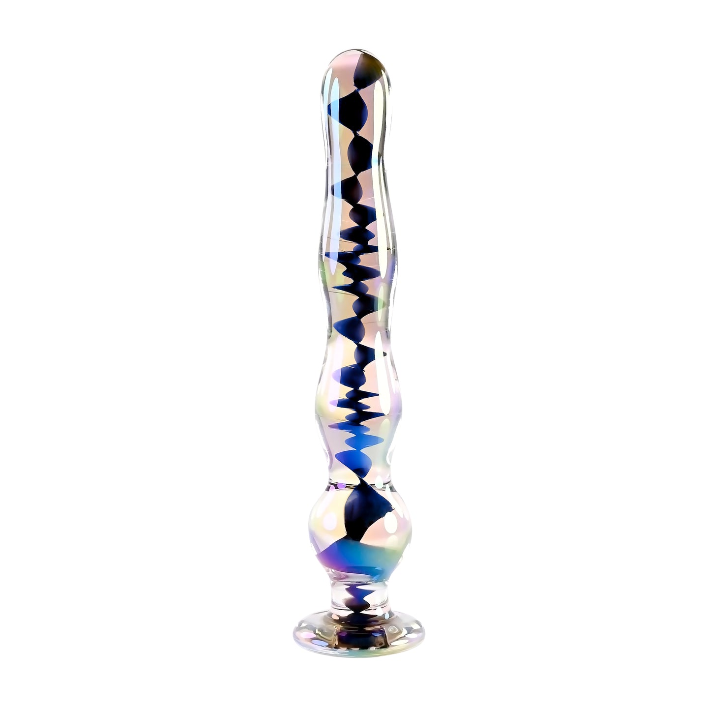 Playboy Jewels Wand Glass Probe from Evolved Novelties. Introducing the Jewels collection, destined to be a favorite in your sex toy drawer. The Jewels Wand features a narrow, tapered tip with three graduated beads along the shaft that become rounder and more stimulating as they grow. Made of body safe Borosilicate Glass, this magic maker will cast a spell on you as it shimmers with a crystal iridescent finish and a dark interior spiral, ending in a flared safety base that features the Rabbit Head Design. Enjoy temperature play by immersing the toy in warm or cool water before use. Panel details: Play with me key feature shatter resistant Glass, beaded shaft. Non-vibrating. Material: Borosilicate Glass. Waterproof, submersible. 5 years warranty. Size specifications: height 8 inches, depth 1.75 inches, width 1.75 inches. Insertable length 7.25 inches, diameter 1.39 inches. Categories: Anal Toys, Prostate Massagers, P-Spot Stimulators, Probes, Sticks, Rods, Dildos, Dongs, G-Spot, Anal Beads. 2024.